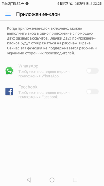 The shell allows you to create a second copy of the WhatsApp application and Facebook to use two accounts at once. In EMUI, I saw for the first time that such a function was built into the system.