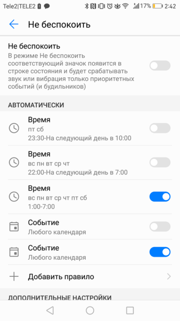 There is a 'Do not disturb' mode, which turns off all notifications, you can leave calls and messages from priority contacts, as well as an alarm clock. You can configure automatic activation of the mode according to a schedule or events in the calendar.
