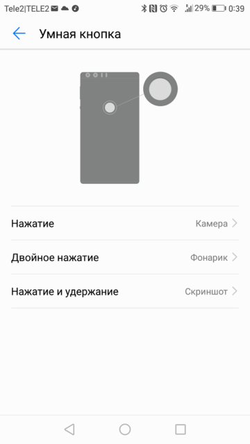 I would like to pay special attention to setting up the button on the back of the smartphone, which has a built-in fingerprint scanner. Huawei called it a 'smart button'. It can be configured with three single-tap, double-tap, or tap-and-hold actions. I have a camera launch, a flashlight and a screenshot assigned so.