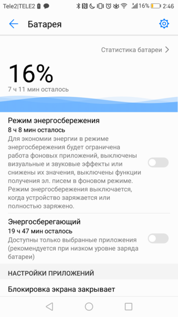 The system has flexible work with power consumption. There are two power saving modes. Sparing. where the transfer of data and the work of applications in the background is limited, animations are turned off and the brightness of the screen is reduced, and the second is aggressive, in which only 6 selected applications will work. You can also save energy by programmatically lowering the display resolution. I did not check the functionality of the function, but I did not see any visual changes in the image.